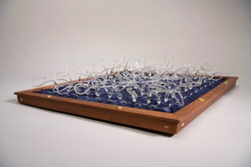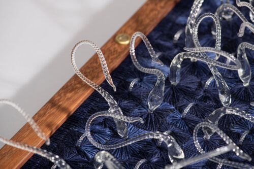 Salvaged borosilicate glass (Mayflower Glass), glass lampworking technique, Merino wool, hand embroidery, Padauk wood