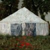 The paintings are often constructed from several elements giving them a frozen static quality.  The weather is oppressive, about to storm or kick  up wind whilst red light reflects from clouds. The water or mud isolates structures and trees, making islands and increasing the sense of unease.  Rather than the uncanny however, the paintings pursue those small moments of uncertainty, or hesitancy in our understanding or perception of reality and consequently realism. Elements give way to each other,  grass becomes mud, becomes water which undermines the stillness, there is an undercurrent of flux or motility, of places emerging and submerging. The paintings are on a small or miniature scale making these worlds more focused and intense. They are not bodily landscapes but rather operate as small hallucinations or worlds running concurrently or beneath reality, formed by minute perceptions.