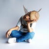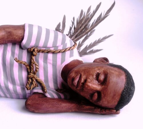 Fired stoneware, epoxy, feathers, wire, acrylic and oil