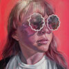 ‘This intense portrait is centered around the mobile phone, a device we are becoming increasingly slave to. The penetrative gaze heightens the feeling of uncertainty and of unnervingly being watched by multiple viewpoints, described in the painting with the reflections and as a metaphor our world within for social media.’