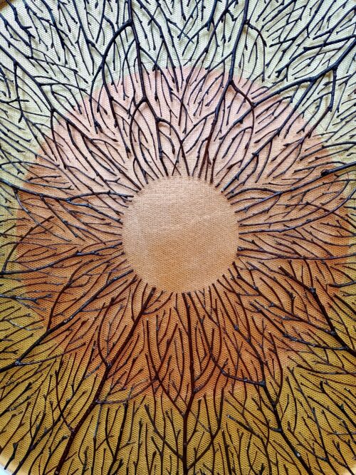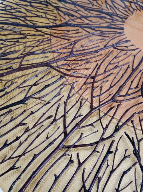 Botanical embroidery on tulle fabric using foraged dried plants, gilding with metal leaf
