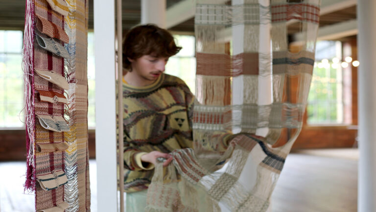 ‘Fox On The Sley’ known as David Fox, is a freelance hand weaver and artist his studio based in Red Lane Studios at Sunny Bank Mills in Farsley. His practice and work are a range of art and installation works and more commercial woven textiles which he sells at fairs and markets. His textiles are inspired by the archive and site of Sunny Bank Mills as well as our general heritage, exploring themes of memory, connection, and mill workers. He weaves on various table looms and a George Wood floor loom. Within his weaves he plays around with various techniques and yarn types from paper, steel mixes, cotton, silk, and wool.